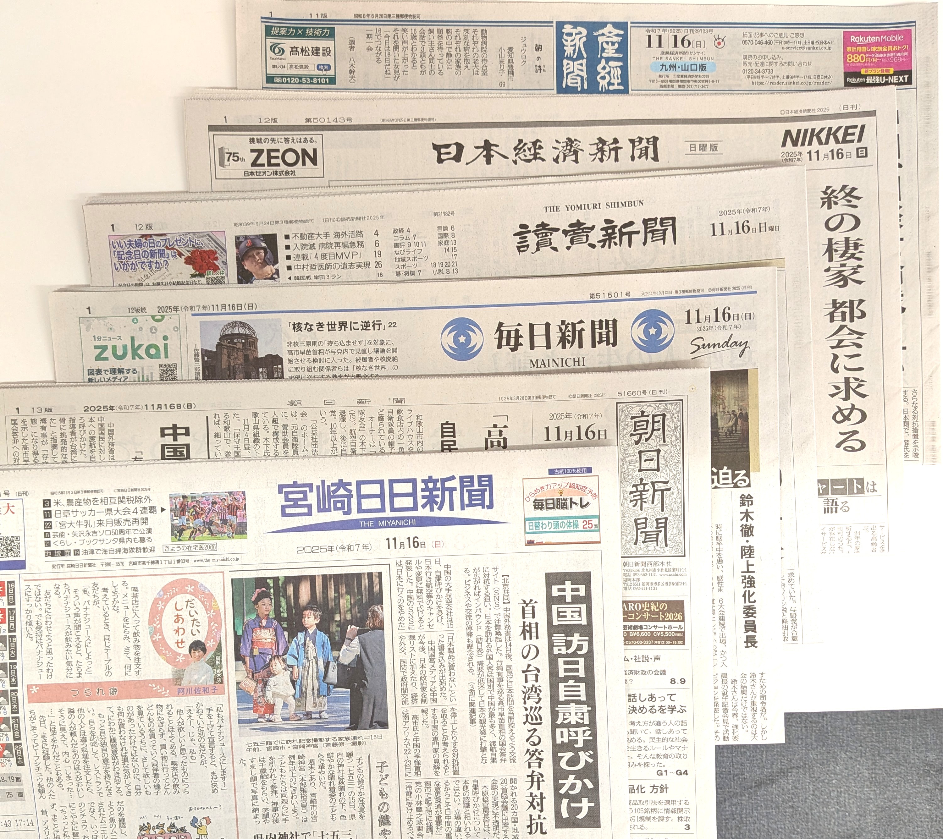 宮崎日日新聞・朝日新聞・毎日新聞・読売新聞・日本経済新聞・産経新聞