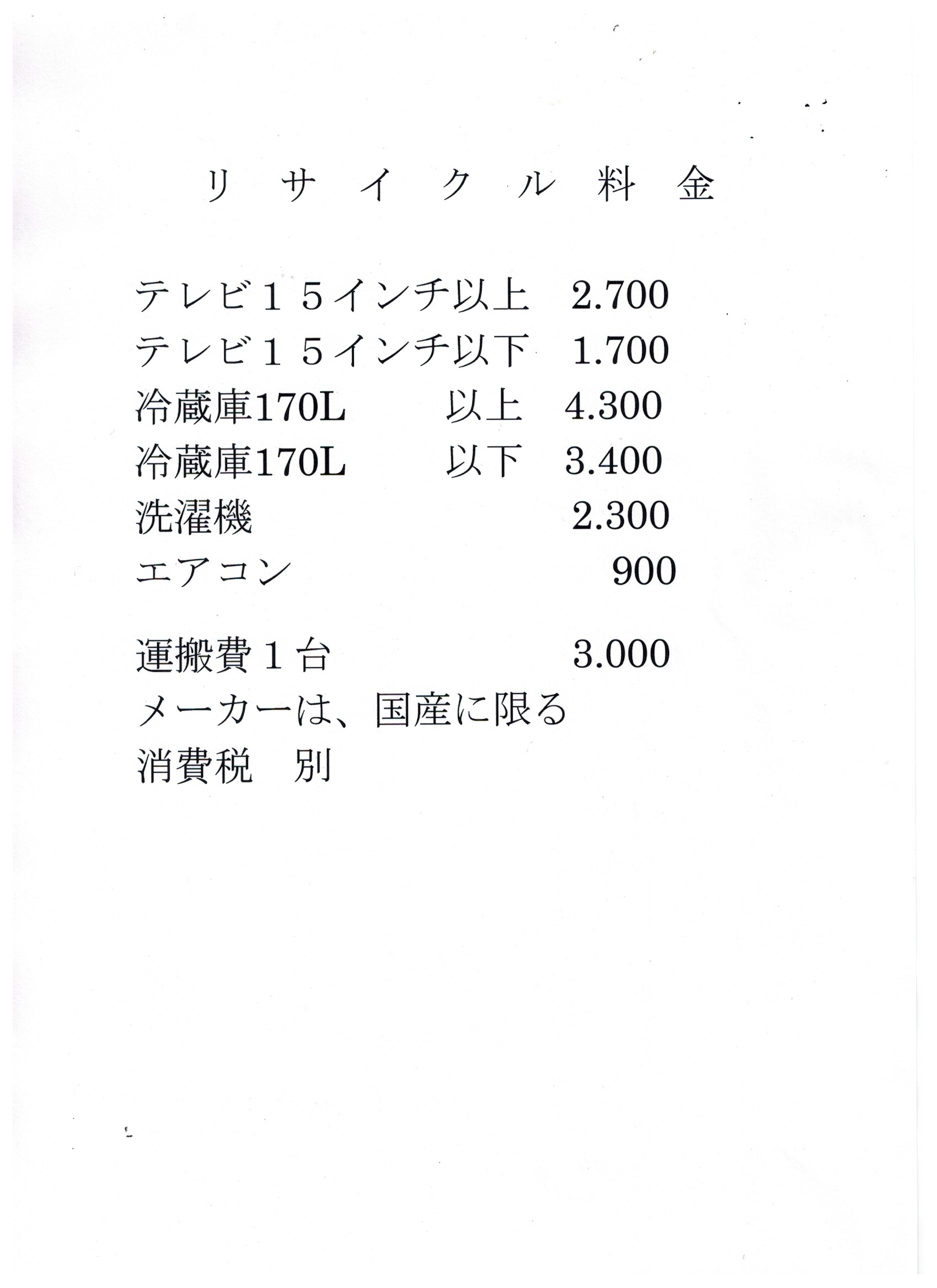 改めてリサイクル商品の基本的な料金をお知らせします。