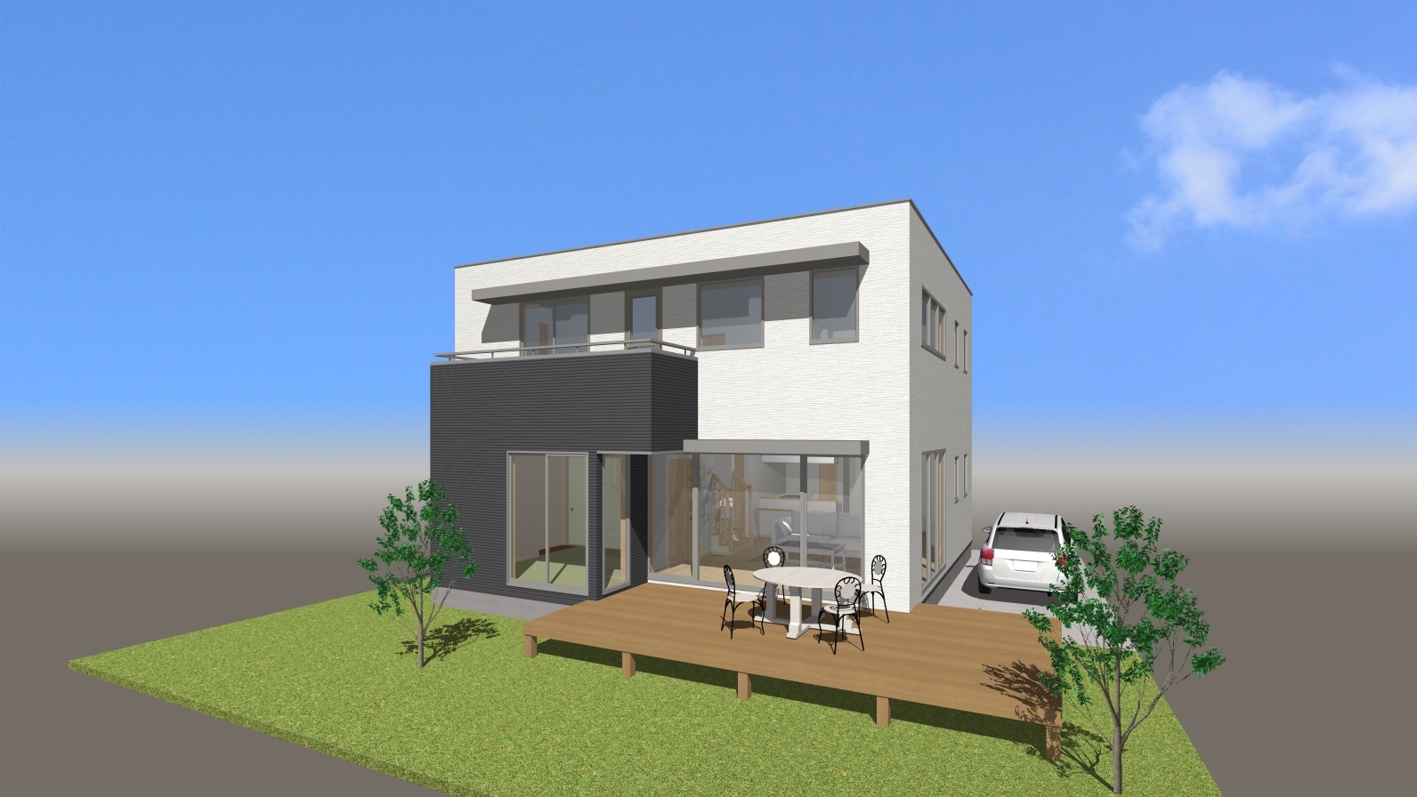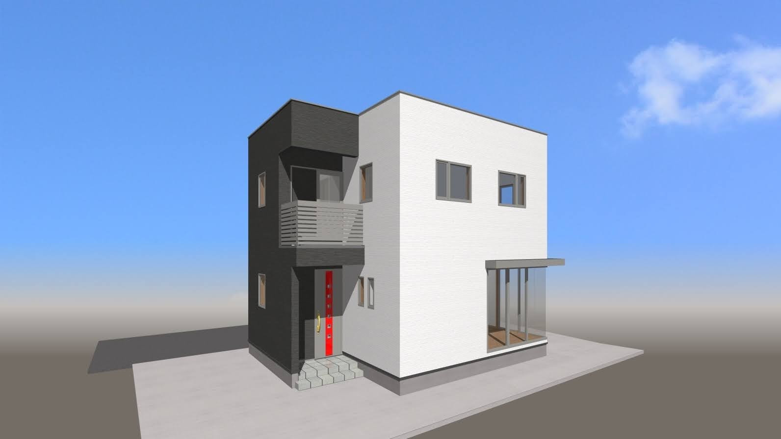 建物の完成予想図は建物本体に敷地全体の外構を含めた総合的な