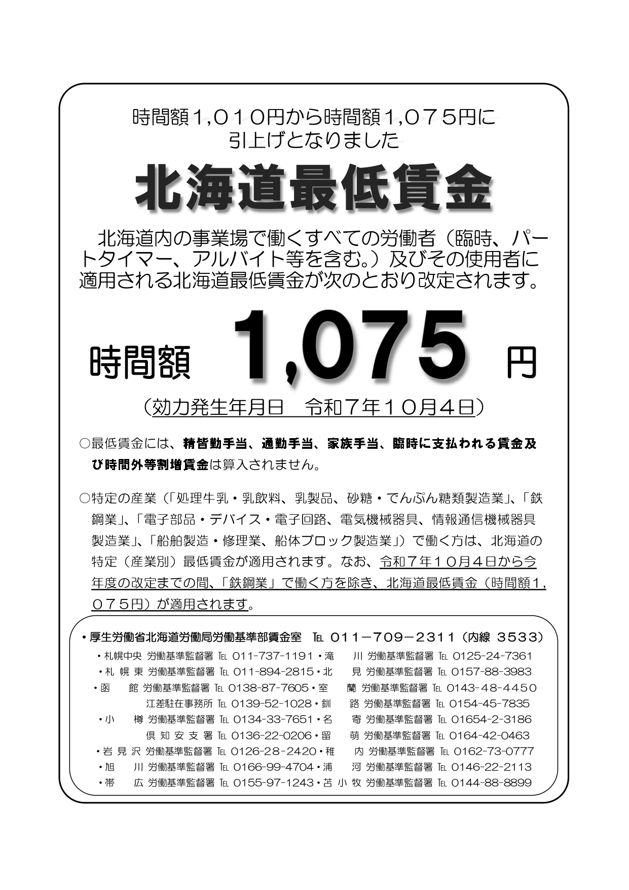 北海道内の事業場で働くすべての労働者(臨時、パートタイマー、アルバイト等を含む。)及びその使用者に適用される北海道最低賃金が次のとおり改正されます。