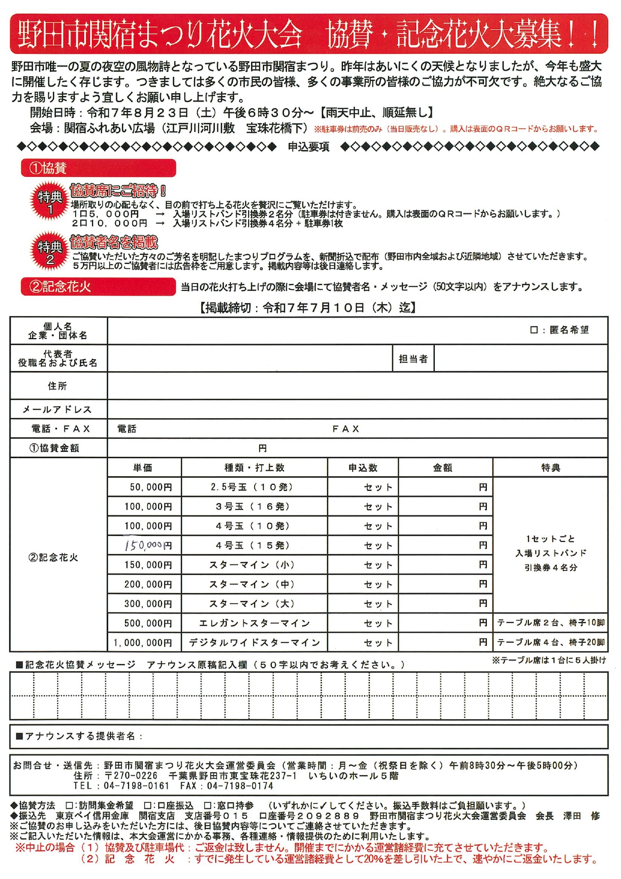 平素より野田市関宿まつり花火大会に温かいご支援を賜り、誠にありがとうございます。