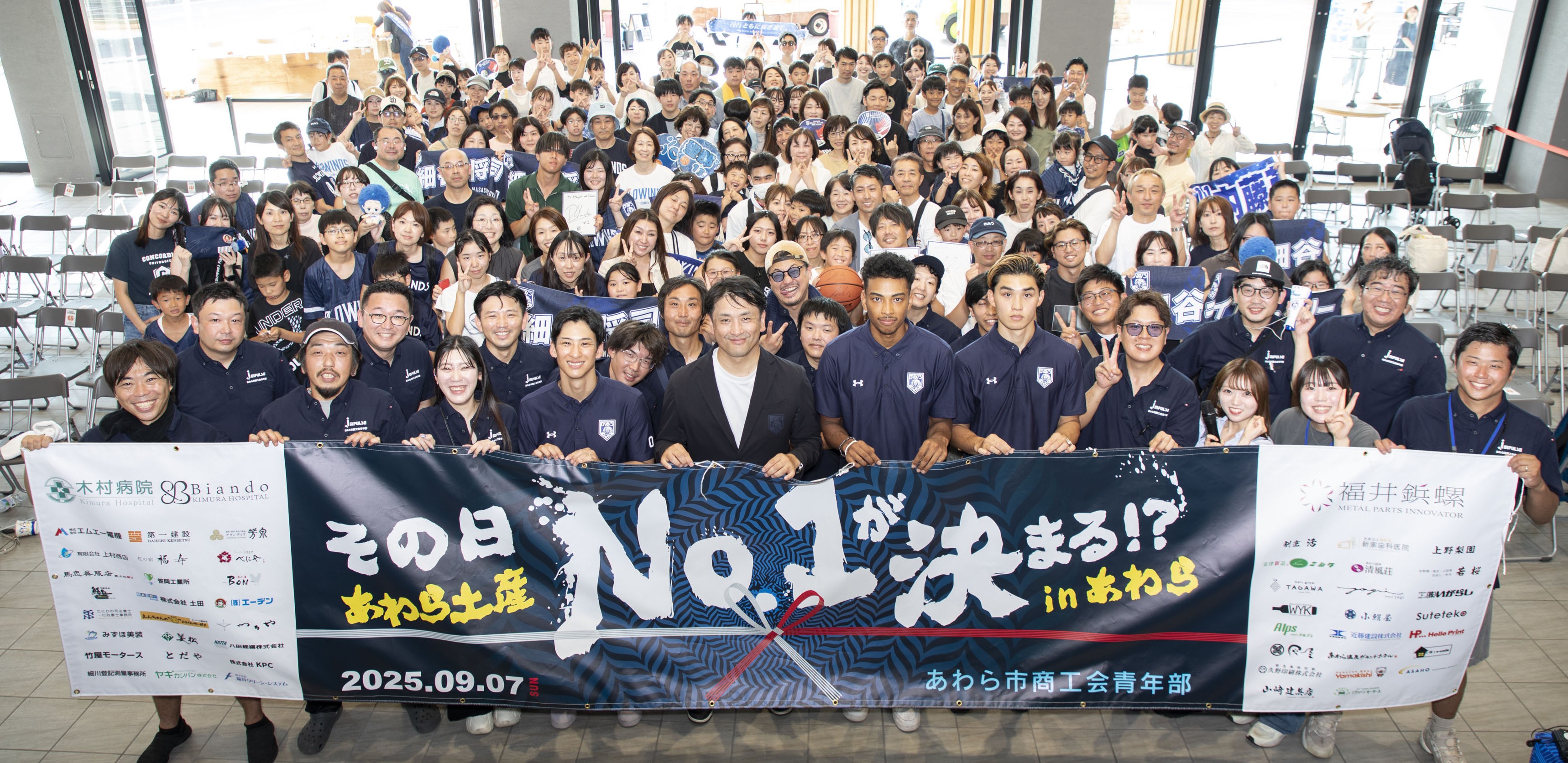 去る、令和7年9月7日(日)に、芦原温泉駅西口賑わい施設「AFLARE(アフレア)」におきまして、プロバスケットボールBリーグ2部の福井ブローウィンズ(BWS)をお招きし、本イベント【その日NO.1が決まるInあわら】を開催しました。本イベントでは、BWSの湯本真士代表取締役と、細谷将司選手、モサク・ダミロラ選手、川島聖那選手の計4名に、あわら市の土産品23品からお気に入りの8品を選んでもらう「あわら土産NO.1コンテスト」を開催。今、勢いのあるBWSから“お墨付き”をもらい、県内外へ土産品の魅力を発信するきっかけとすることで、地域と産業の活性化を図りました。