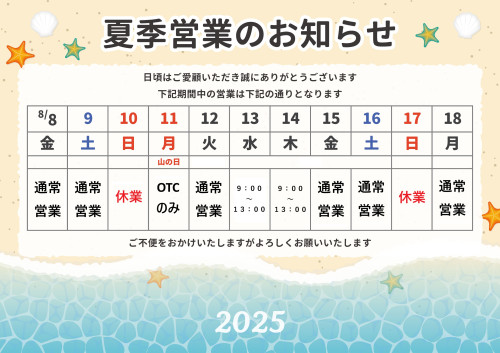 ・9月の営業日のお知らせ9月は通常通りに営業いたします(毎週月曜日 + 第1・第3日曜日が定休となります)暑い日が続いておりますので、皆様も体調にお気を付けくださ...