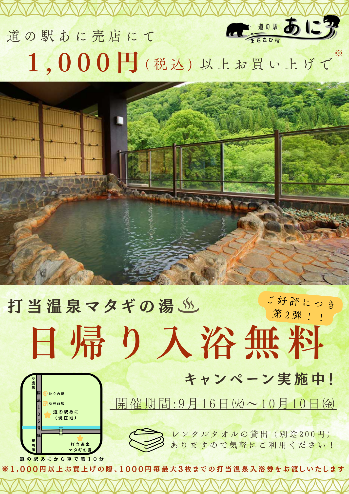 [道の駅あに・マタギの里] 【イベント・キャンペーン情報】第2弾!打当温泉に無料で入れる!?お得なキャンペーンを実施いたします🎉