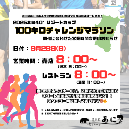 [道の駅あに・マタギの里] 【周辺イベント】秋田100キロチャレンジマラソン大会開催!+大会当日の道の駅営業時間変更