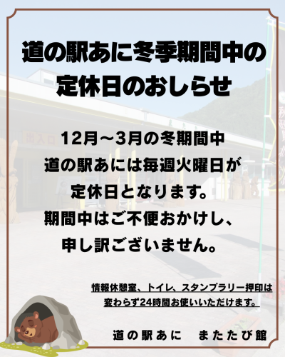 [道の駅あに・マタギの里] 【施設・施設設備】道の駅あに冬季定休日について