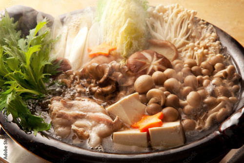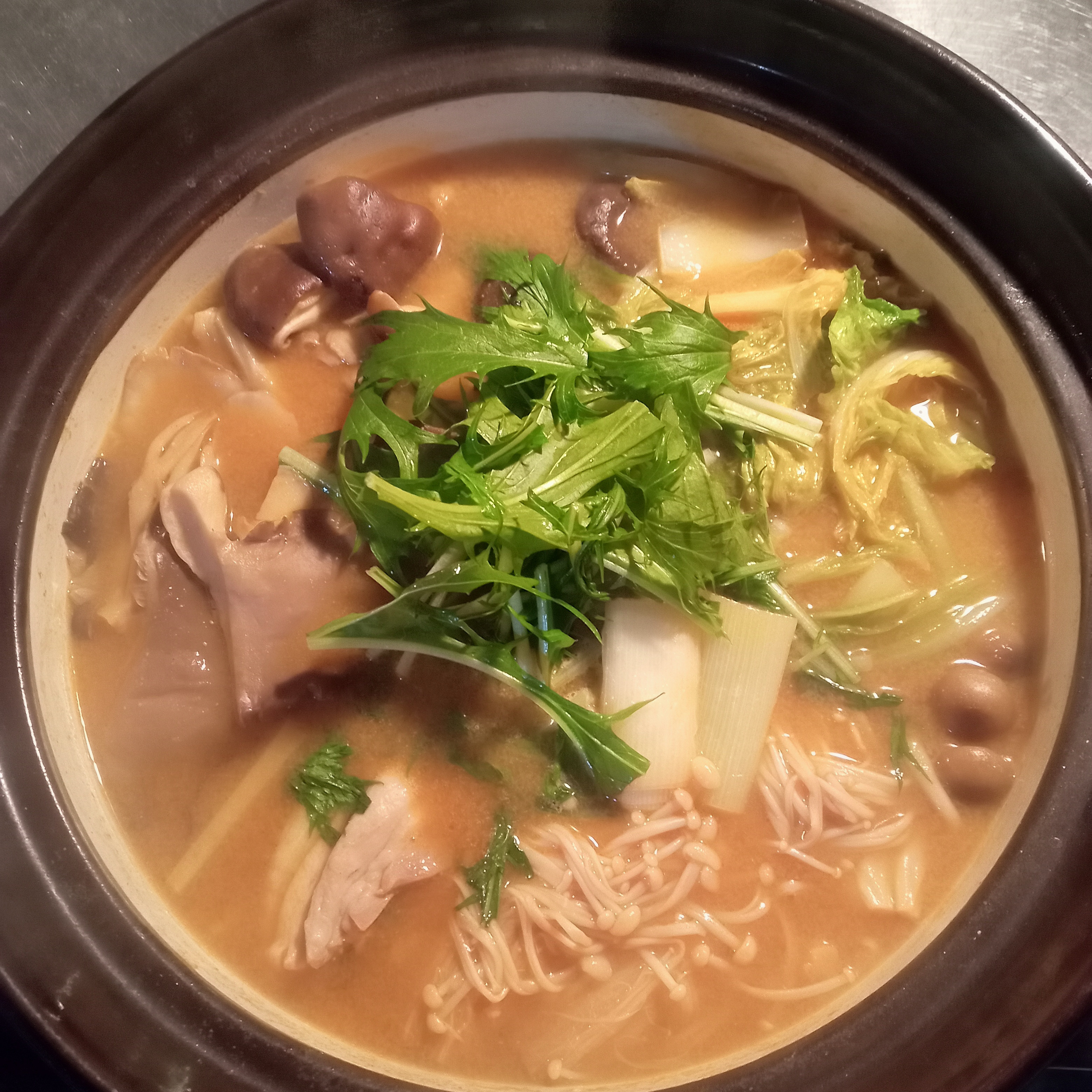地鶏、きのこ旨味を味わって頂ける風味豊かな味噌味スープの鍋です。
