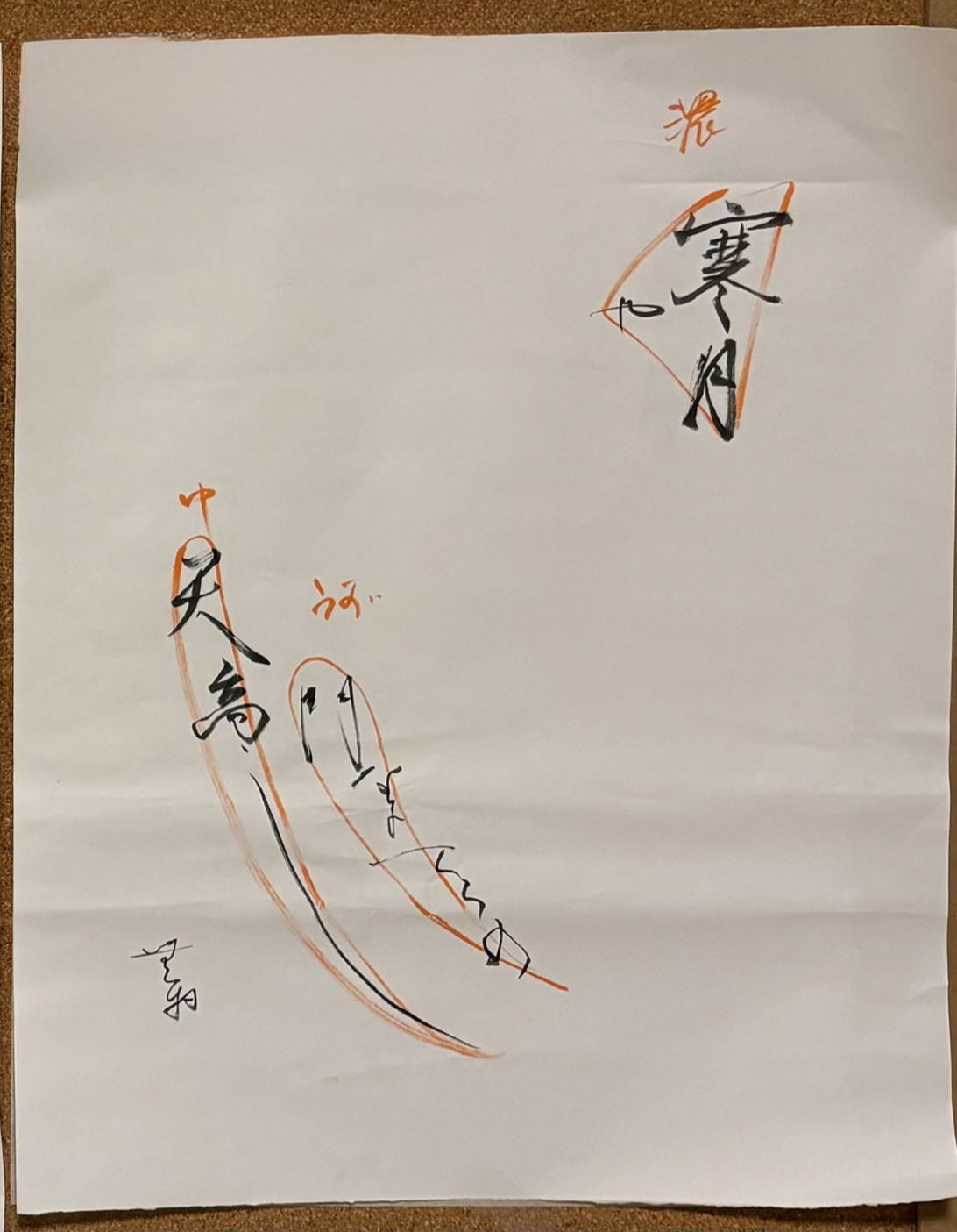 『寒月』の字軸が左下に傾いているのに合わせて『や』も左下に配置をすると、読み手の視線を中七、下五に自然に誘導できます。