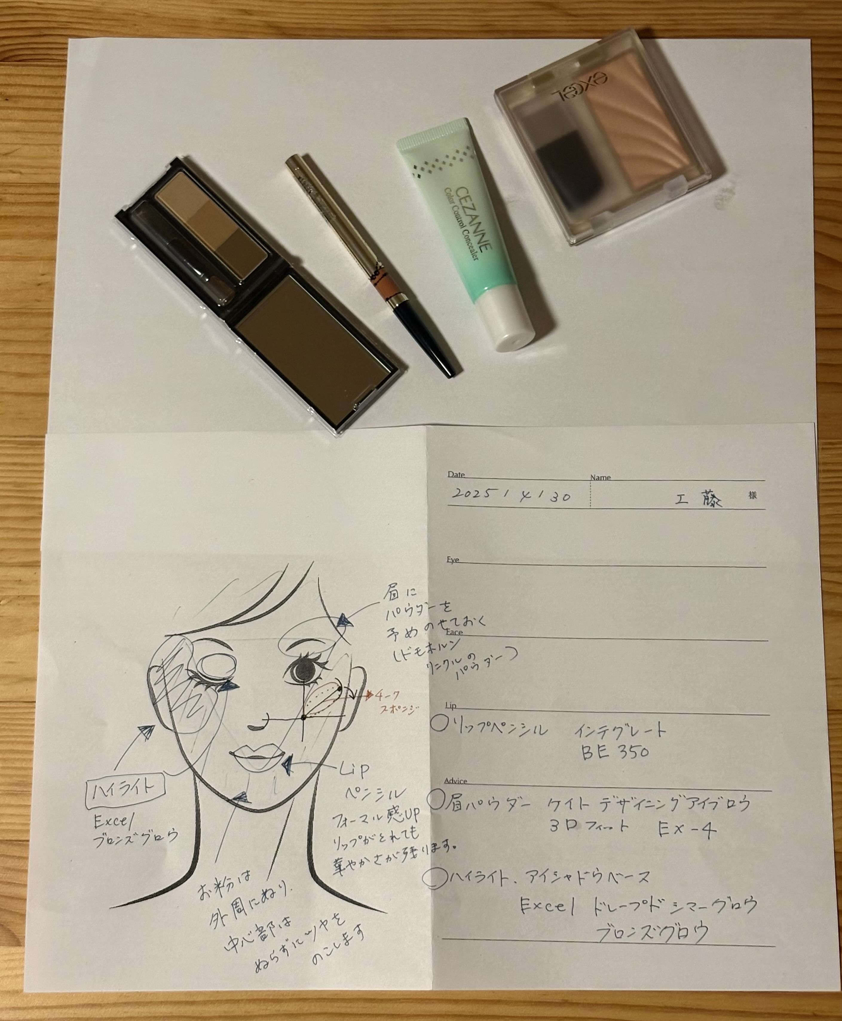 メイクレッスンの最後にメイクのレシピを手渡してくださって、終了です。