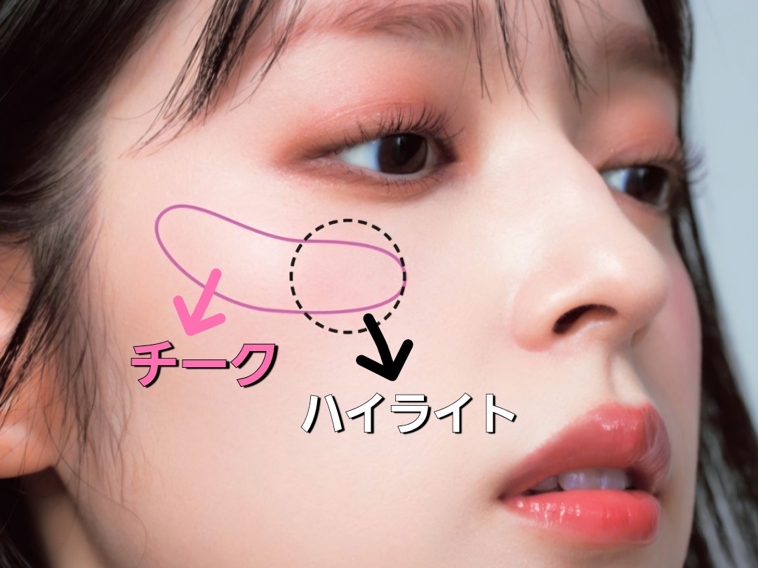 チークは主張しすぎずナチュラルに!仕込みハイライトで、内からにじむようなツヤを演出します✨