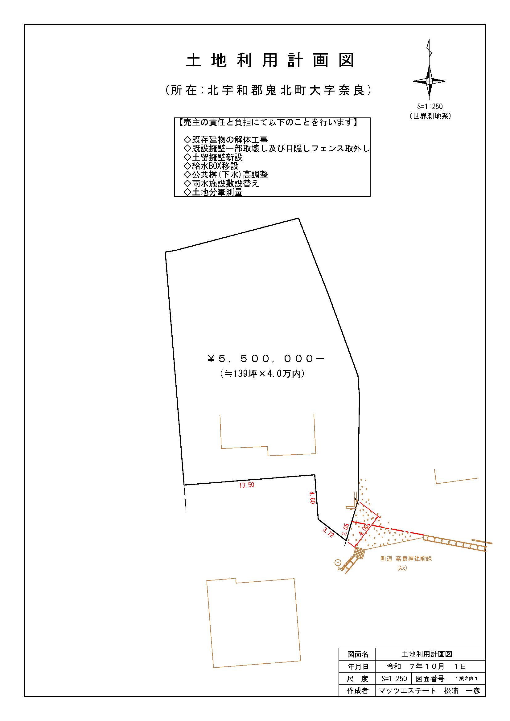 都市計画 :区域内 非線引 給水 :公営排水 :集落排水(下水)接道 :町道に≒2.05m 引渡条件 :売主にて次のことを行います/①既存建物の解体 ②既設擁壁一部取壊し及び目隠しフェンス取外し ③給水BOX移設 ④公共桝(下水)移設 ⑤雨水施設敷設替え ⑥土地分筆測量 引渡し :適宜取引形態:媒介