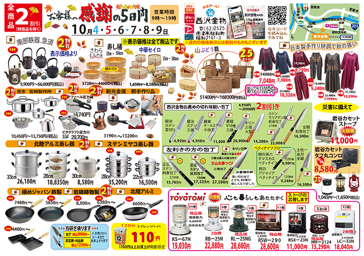 皆さんこんにちは。普段はなかなか手が出せない逸品を特別価格でご用意しました。山葡萄バッグ、鉄瓶、ステンレス鍋、防災グッズなど、20~25%OFFでご提供。ご来店お待ちいたしております、よろしくお願いします。