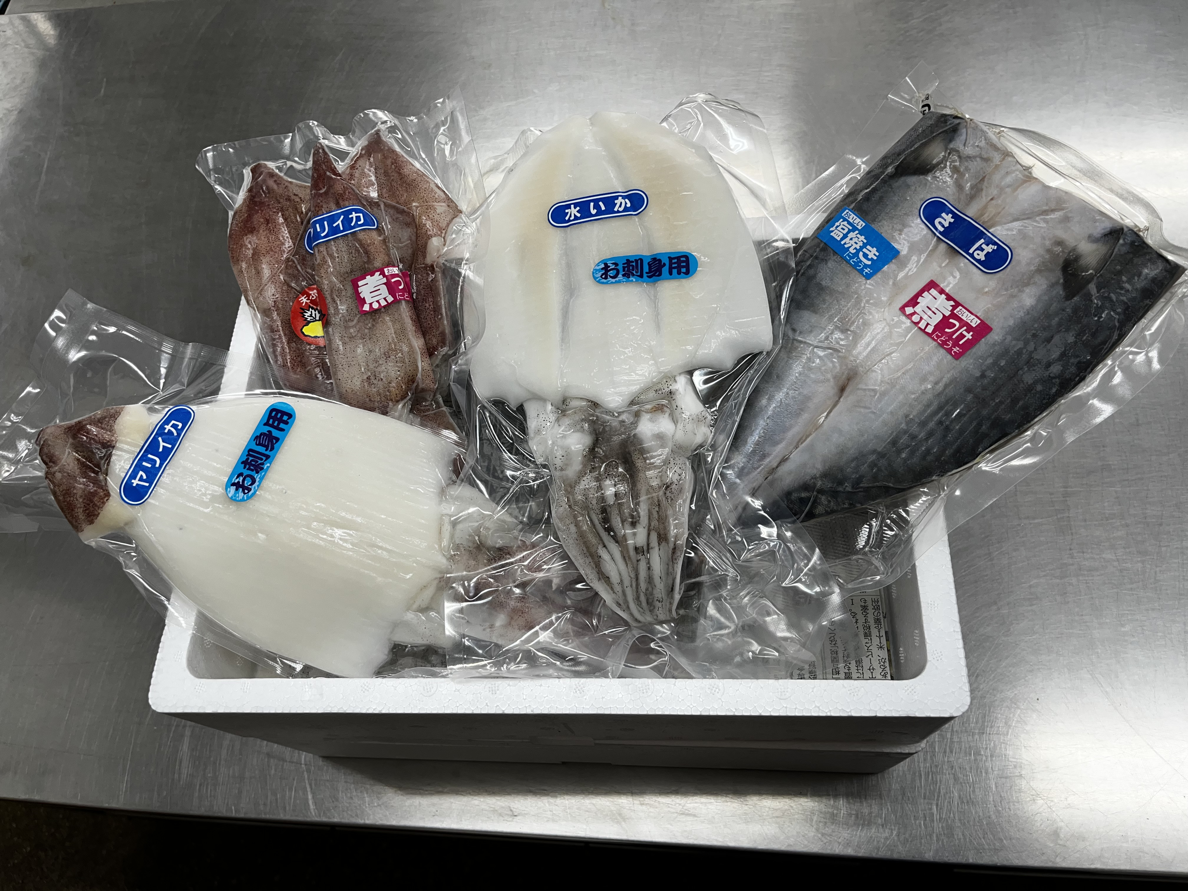 とヤリイカ、煮つけ用真空パックは煮付け用ヤリイカ、煮付け・塩焼き用のサバが