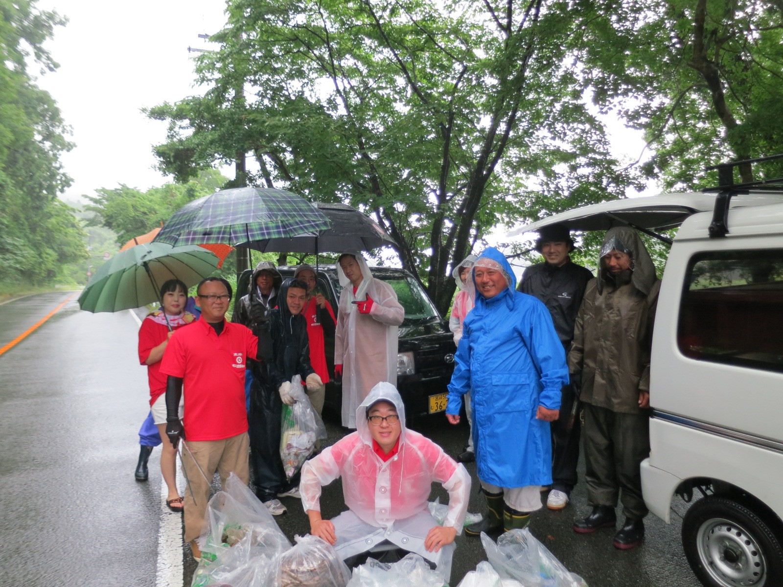 県道28号線山田溜池駐車場周辺。あいにくの雨の中でしたが、部員14名が参加し、午前7:00~からの道路清掃活動を実施しました。