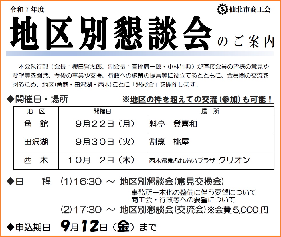 本会執行部(会長:櫻田賢太郎、副会長:髙橋康一郎・小林竹典)が、直接会員の皆様の意見や要望等を聞き、今後の事業や支援、行政への施策の提言等に役立てるとともに、会員間の交流を図るため、地区ごとに「懇談会」を開催します。