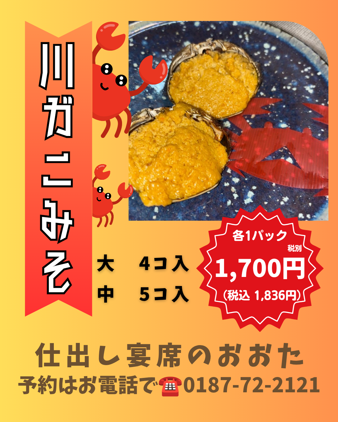 大仙市北楢岡の仕出し宴席のおおたです。【川カニみそのご予約受付中】当店味自慢の川カニみそ。秋田県産川カニを使用した濃厚な川カニみそをご賞味ください!大4コ/中...