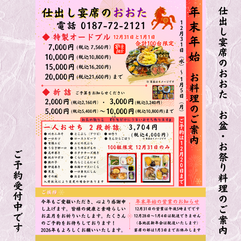 ※たくさんのご予約ありがとうございました。受付終了いたしました。毎度ご利用ありがとうございます。大仙市北楢岡の仕出し宴席のおおたです。12月20日まで年末年始のお...