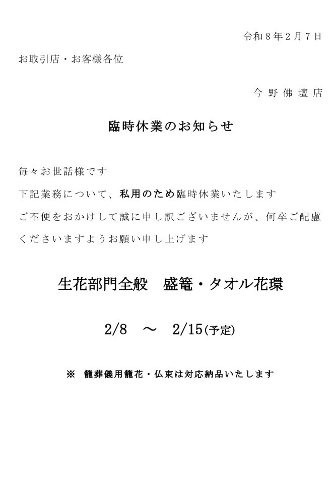 [株式会社今野佛壇店] 【臨時休業のお知らせ】