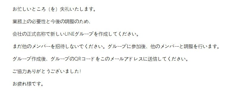 現在、経営者等をかたり法人等のメールアドレス宛てに電子メールを送り、「LINEグループ」を作成させようとする不審なメールが増えております。