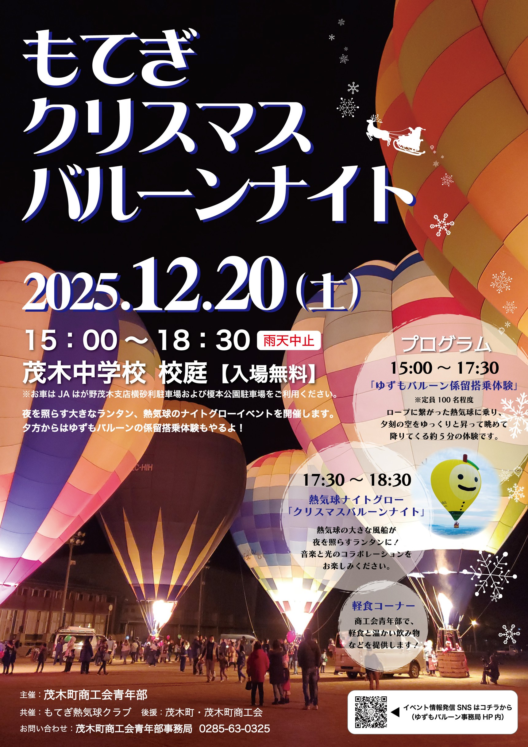 12月20日(土)、茂木中学校の校庭が幻想的な光に包まれます。 暗闇に浮かび上がるカラフルな熱気球は、まるで大きなクリスマスオーナメント🎄✨