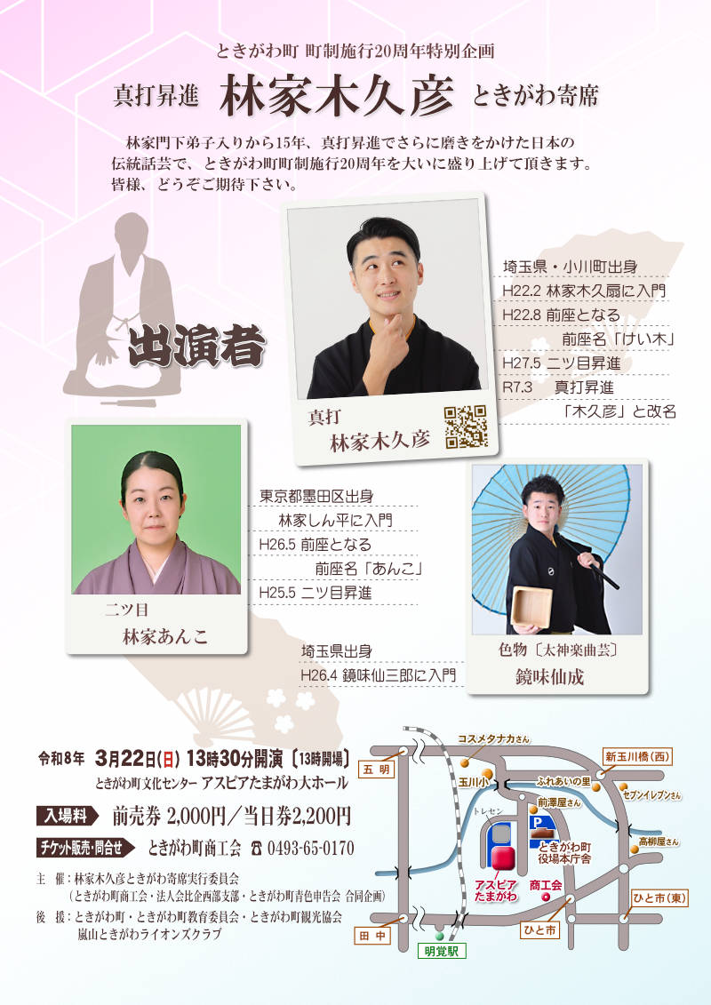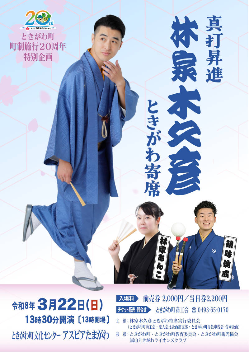 | 主催 | 林家木久彦ときがわ寄席実行委員会 (ときがわ町商工会、法人会比企西部支部、ときがわ町青色申告会/合同企画) |