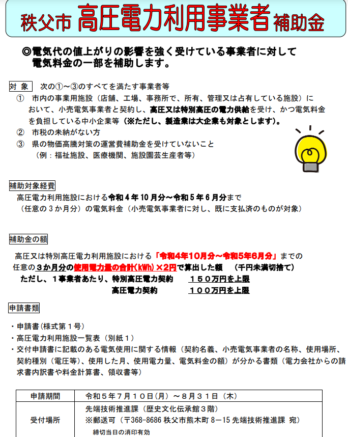秩父市では、電気料金の値上がりの影響を強く受けている市内の事業用施設で高圧、または特別高圧の電力契約により、電気供給を受けている事業者に対して、電気料金の一部を助成しますので、ぜひご活用ください。