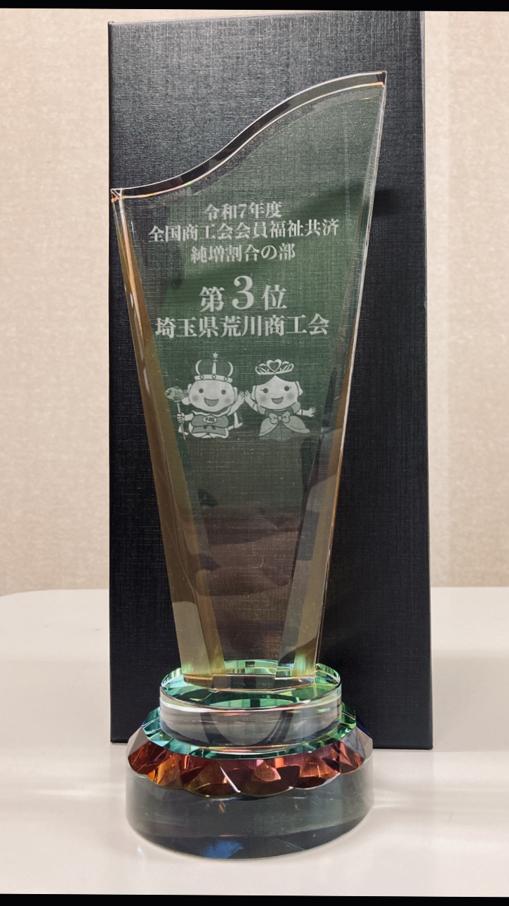 また檀上、昨年度の優秀商工会の発表があり、森全国連会長から荒川商工会(純増割合3位)にトロフィーが授与されました。