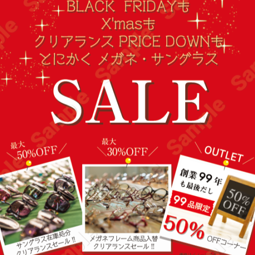 11/28(土)~12/25(火)の約1か月間メガネ・サングラスのセールを行います。メガネフレームは商品入れ替えクリアランスセール「最大30%off」サングラスは在庫処分セ...