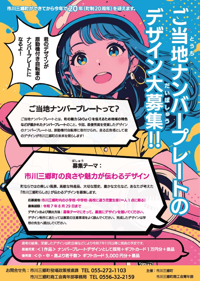 市川三郷町商工会青年部と市川三郷町は、今年で町制20周年を迎えるにあたり、原動機付自転車のご当地ナンバープレートのデザインを募集します。あなたのアイデアが詰まったデザインが、町を走るナンバープレートとして、市川三郷町の魅力を全国に発信する「走る広告塔」となります!ぜひこの機会に、子どもたちの自由な発想で、町の未来を明るく照らすデザインを考えてみませんか? 皆様からのたくさんのご応募をお待ちしております!