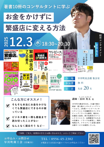 [早川町商工会] 【セミナー情報】 12/3(水)開催|お金をかけずに繁盛店にする方法セミナー