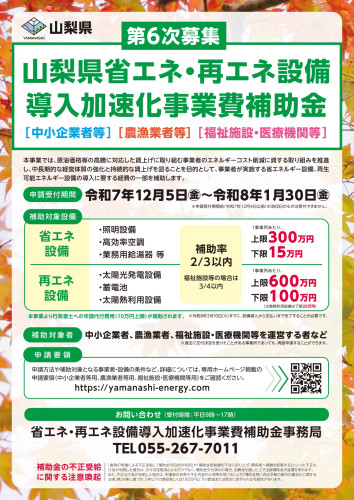 [都留市商工会] 【お知らせ】山梨県賃金アップ企業等省エネ・再エネ設備導入加速化事業費補助金の第6次募集について