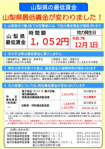 山梨県の最低賃金が変わりました。詳しくは下記サイトをご覧くださいhttps://jsite.mhlw.go.jp/yamanashi-roudoukyoku/hourei_seido_tetsuzuki/tingin_taisyokukin/hour...