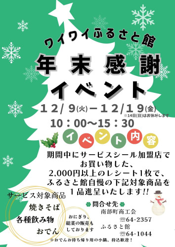 ワイワイふるさと館年末感謝イベント!!期間中にサービスシール加盟店(町内全18店)でお買い物した2,000円以上のレシート1枚で、ふるさと館自慢の商品を1品進呈いたし...