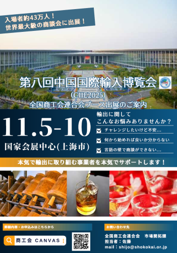 全国商工会連合会では、中小企業・小規模事業者の海外マーケット進出を支援するため、世界最大級の商談会「中国国際輸入博覧会(CIIE2025)」に全国連ブースを設置いた...