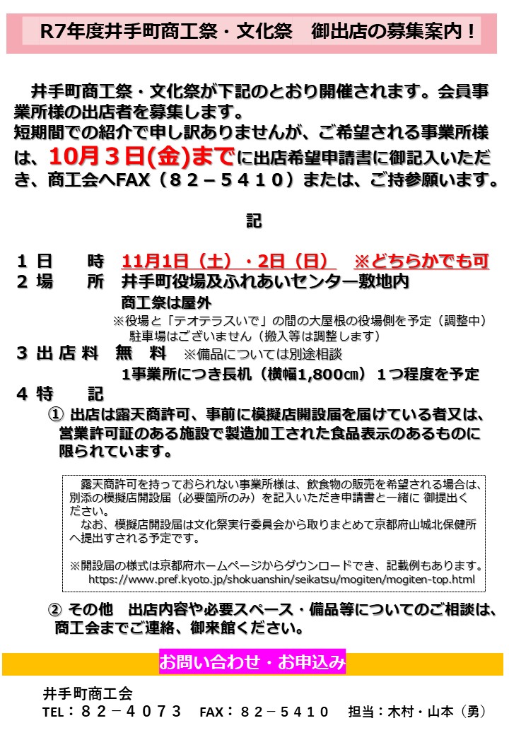 井手町文化祭の「商工祭」開催に係る出店者募集について