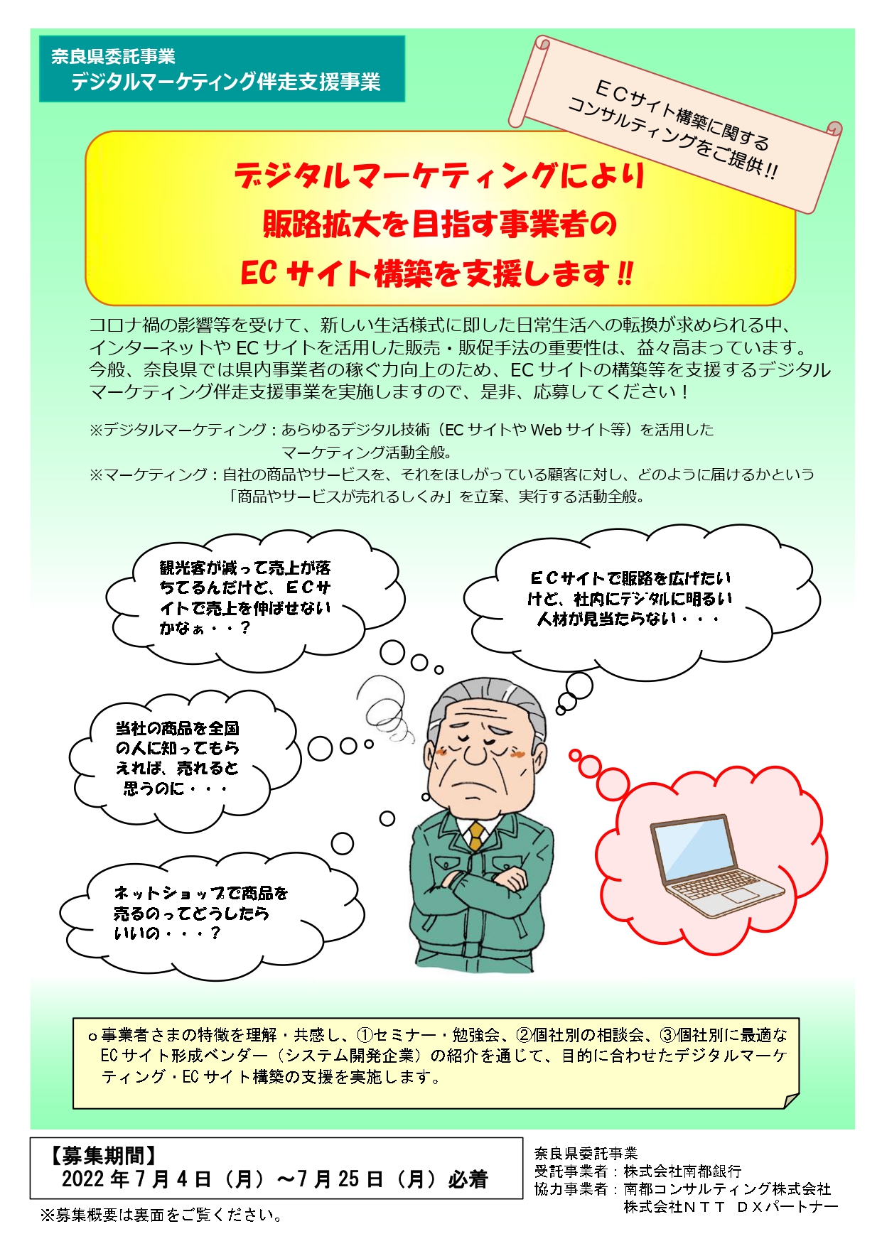 コロナ禍の影響等を受けて、新しい生活様式に即した日常生活への転換が求められる中、インターネットや EC サイトを活用した販売・販促手法の重要性は、益々高まっています。今般、奈良県では県内事業者の稼ぐ力向上のため、EC サイトの構築等を支援するデジタルマーケティング伴走支援事業を実施されますので、今後、ECサイト構築をご検討の事業者様におかれましては、ご活用くださいますようお願いいたします。