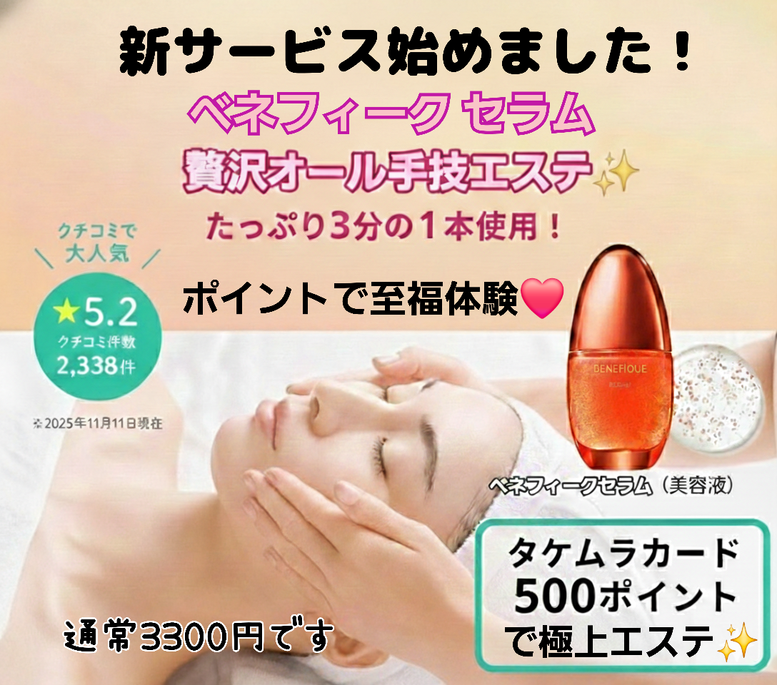 1月に紹介しましたイチオシ👍エステ『ベネフィーク心身ネットワークプログラムエステ』通常1回3300円がタケムラカード500ポイントで体験できちゃいます!!気持ちいい~...