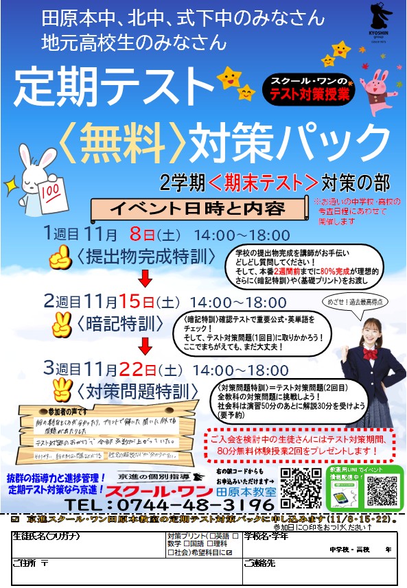 [京進の個別指導 スクール・ワン田原本教室] 【11/8・15・22㊏】定期テスト<無料>対策パック~2学期期末テスト対策の部~のご案内 |京進|個別指導|塾|テスト対策|田原本中|北中|式下中|田原本町|三宅町|川西町