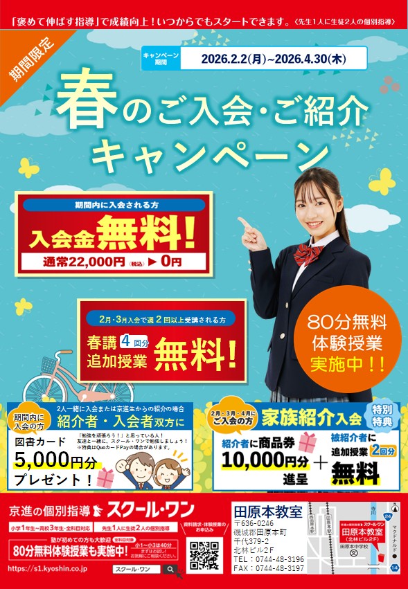 [京進の個別指導 スクール・ワン田原本教室] 2025 京進の個別指導スクール・ワン 冬のご入会・ご紹介キャンペーン