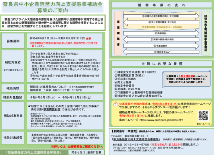 以前から当LINE配信でもご案内しておりました、奈良県中小企業経営力向上支援事業補助金について、県事務局より2ヶ月間の申請期限延長と申請要件の追加、予算総額の追加についてご案内がありました。
