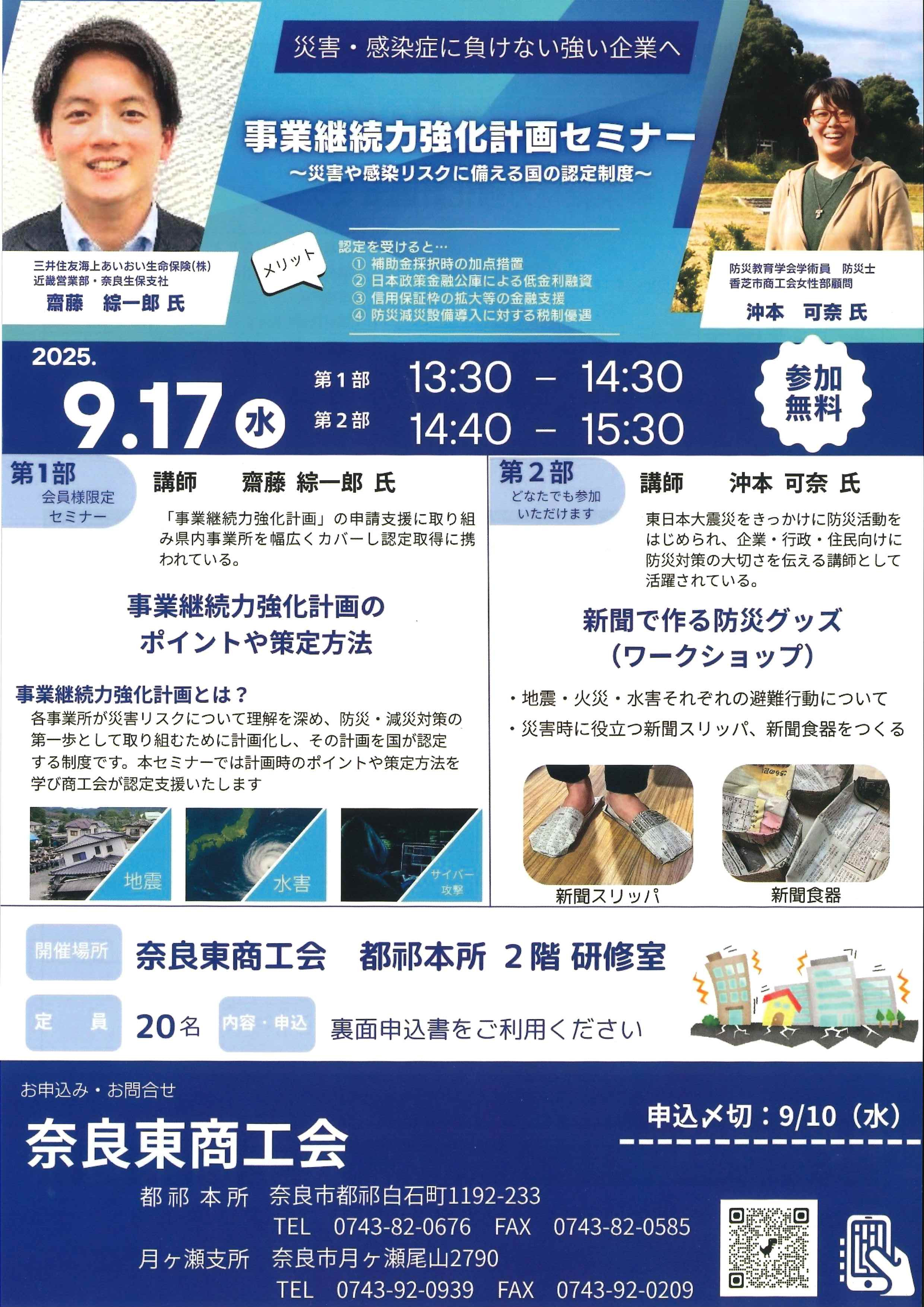 奈良東商工会では、多発する豪雨・地震などの自然災害や感染症リスクに備えるセミナーを開催します。
