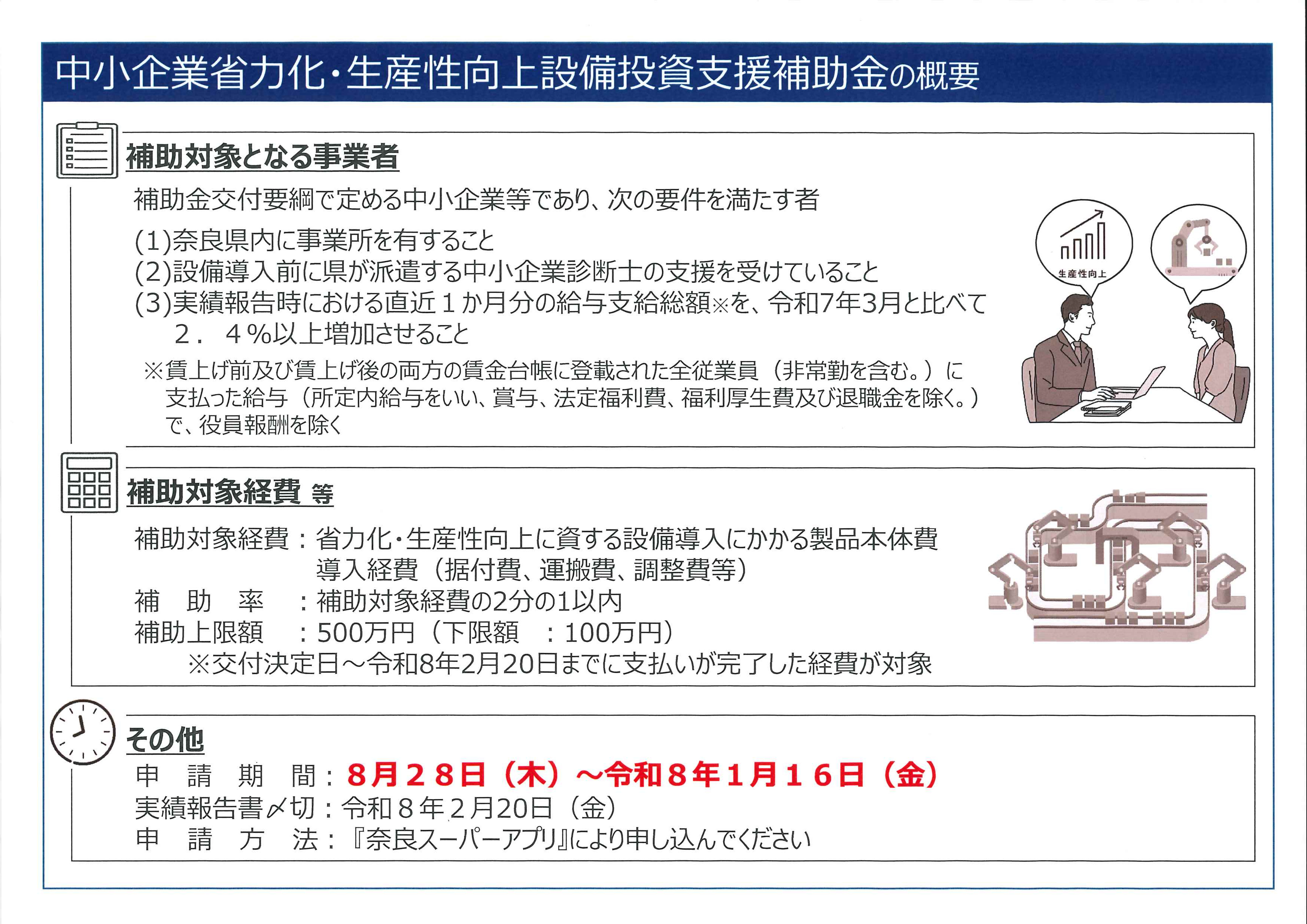 奈良県では、人手不足や物価高騰に悩む中小企業等が生産性向上を図るため、中小企業診断士による専門的な助言・支援を受けて業務プロセスの改善・最適化に取り組み、省力化に資する設備を導入する支援策が公表されました。
