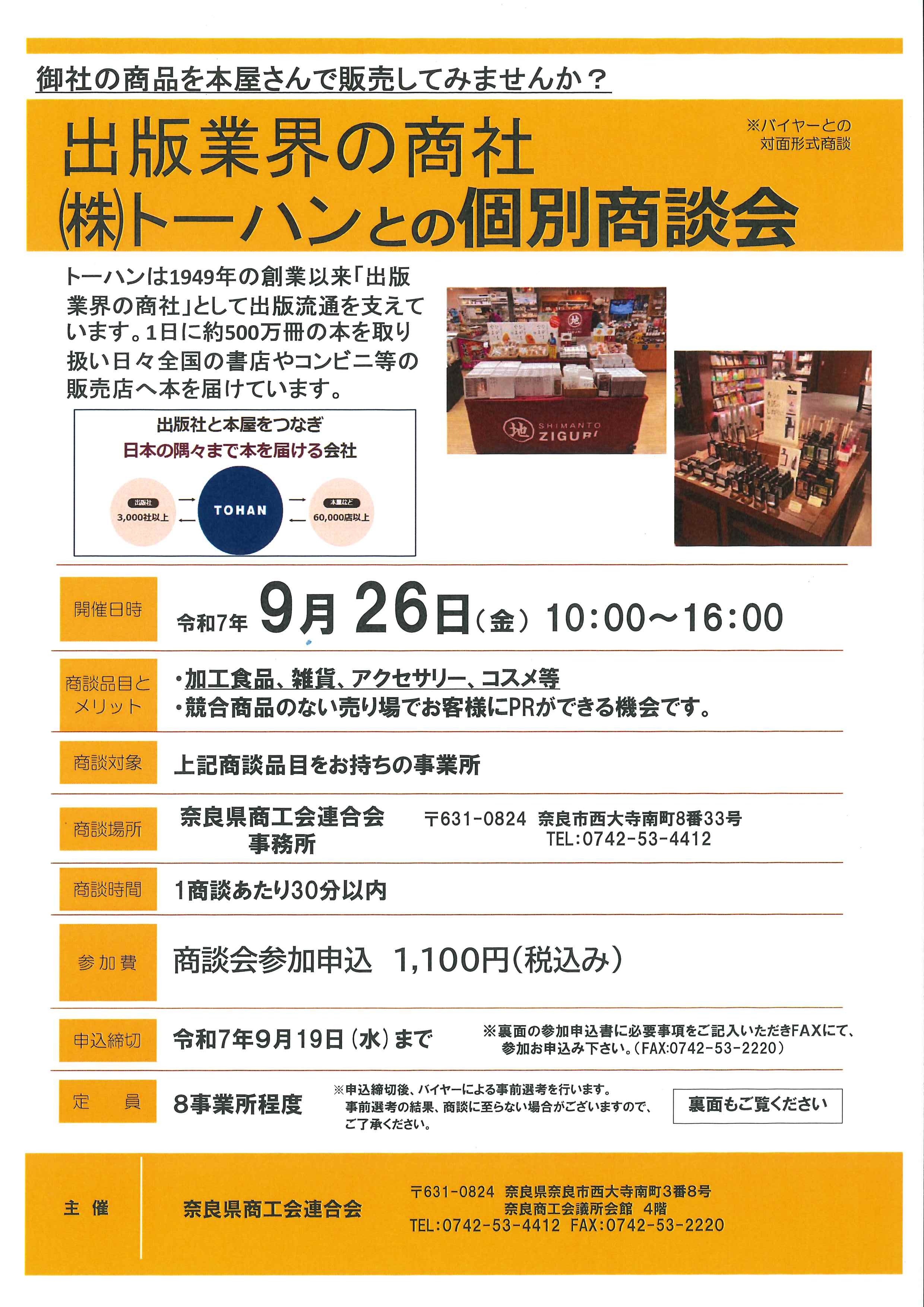奈良県商工会連合会では、加工食品・雑貨・アクセサリー・コスメ等を取り扱われる事業者さまを対象として、出版業界商社である株式会社トーハンとの個別商談会を開催する旨の案内がありましたので、お知らせいたします。