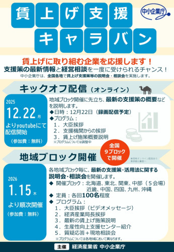 経済産業省は、中小企業・小規模事業者の賃上げを支援するために、全国で施策広報のためのキャラバンを実施します。賃上げに関する施策の最新内容をご紹介するとともに...