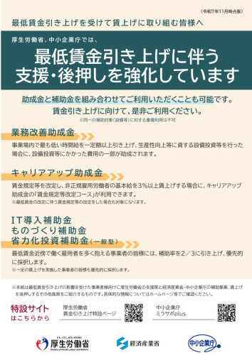 厚生労働省、中小企業庁では、最低賃金引き上げに伴う支援・後押しを強化しています。業務改善助成金やキャリアアップ助成金、IT導入補助金、ものづくり補助金、省力化...