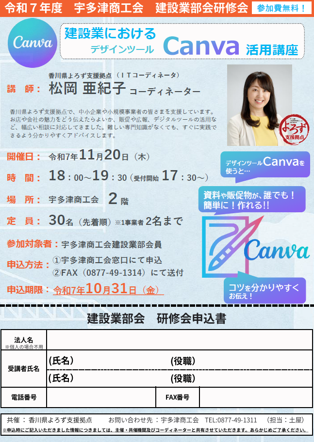 - 対象者:宇多津商工会 建設業部会員(1事業者あたり2名まで)