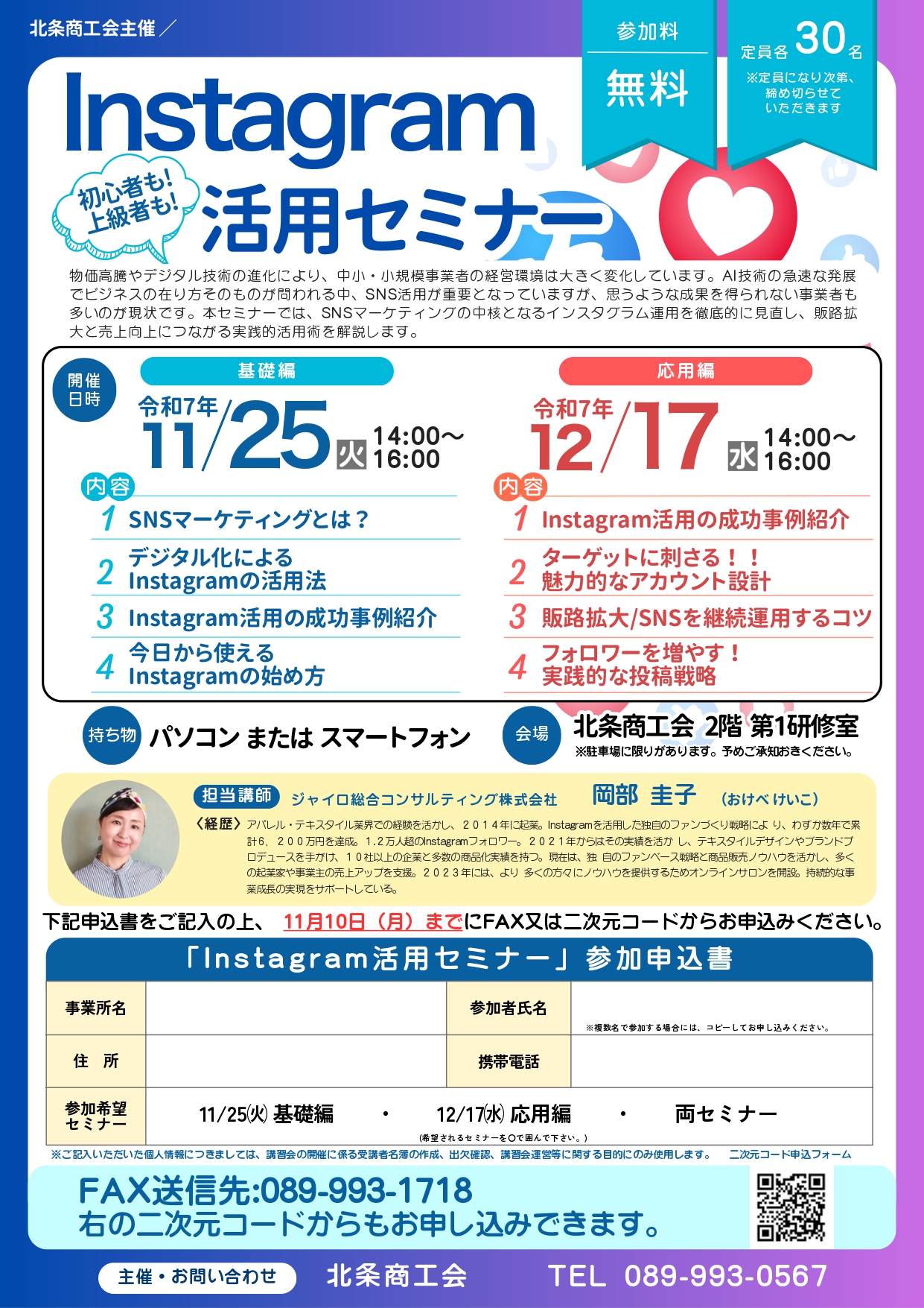 申込み:要(別添、チラシの参加申込書をFAX等により、北条商工会へお申し込みください)