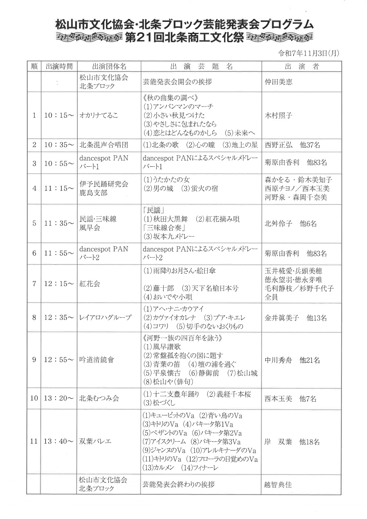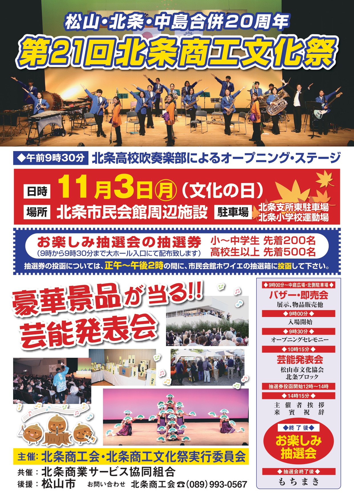北条高校吹奏楽部によるオープニング演奏で開幕し、松山市文化協会・北条ブロック及び地元有志による芸能発表会、各種バザーや特産品の即売会、お楽しみ抽選会等、たくさんのイベントをご用意しております。