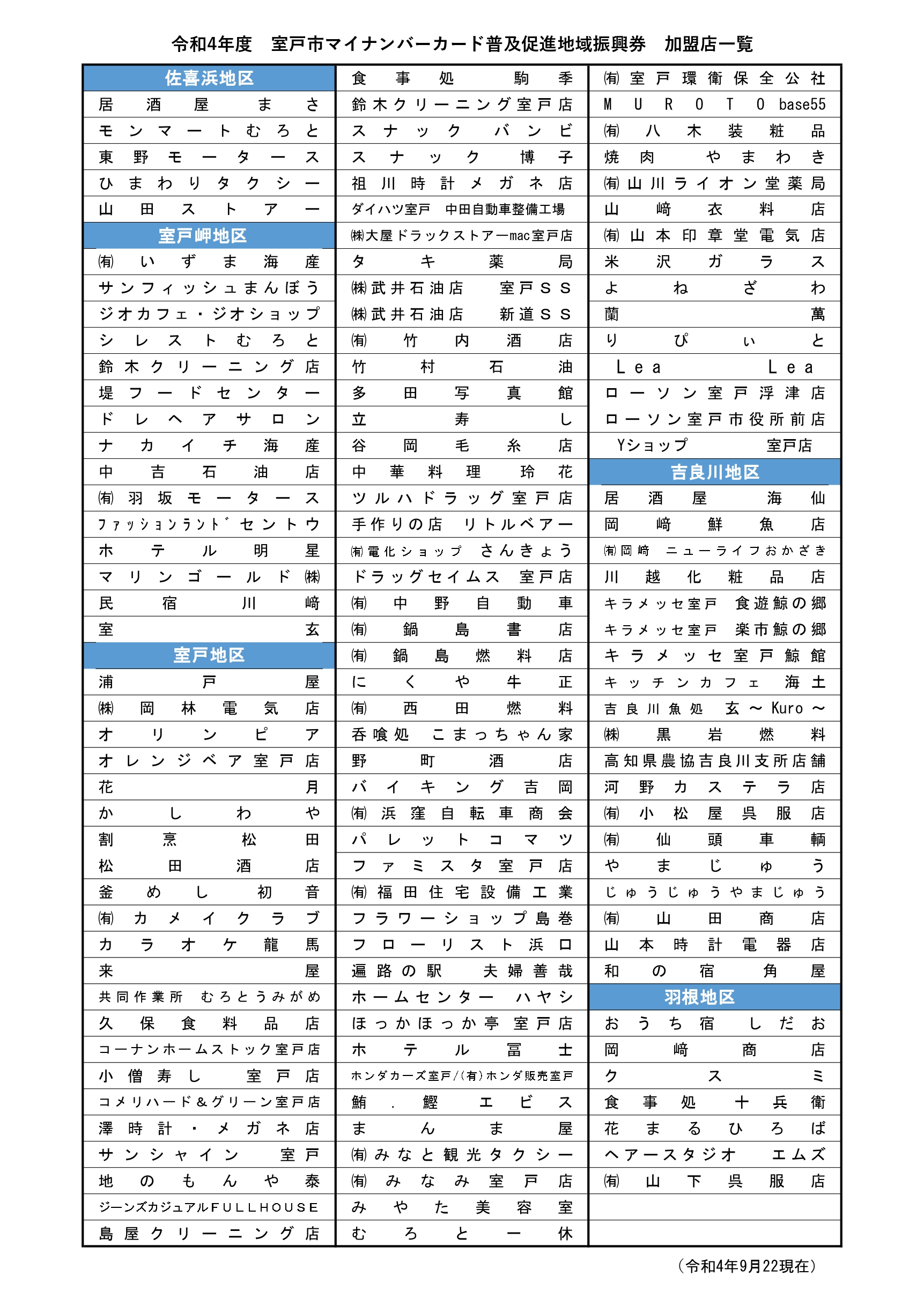 室戸市マイナンバーカード普及促進地域振興券の加盟店に追加があります。最新の一覧表を掲示いたしますのでご確認ください。