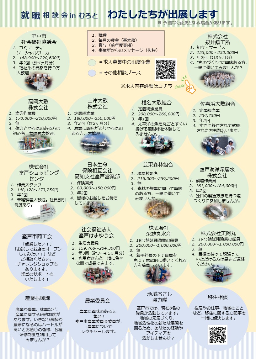 室戸市内の求人募集企業13社が大集結!起業や農業、移住等の相談ブースもあります。